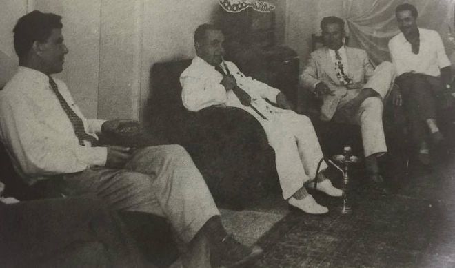 الصورة الثالثة تجمع الاول من اليمين الصحفي عبدالكريم كريديه بجانبه نقيب الصحافة عفيف الطيبي وحاكم الكويت مبارك الصباح.